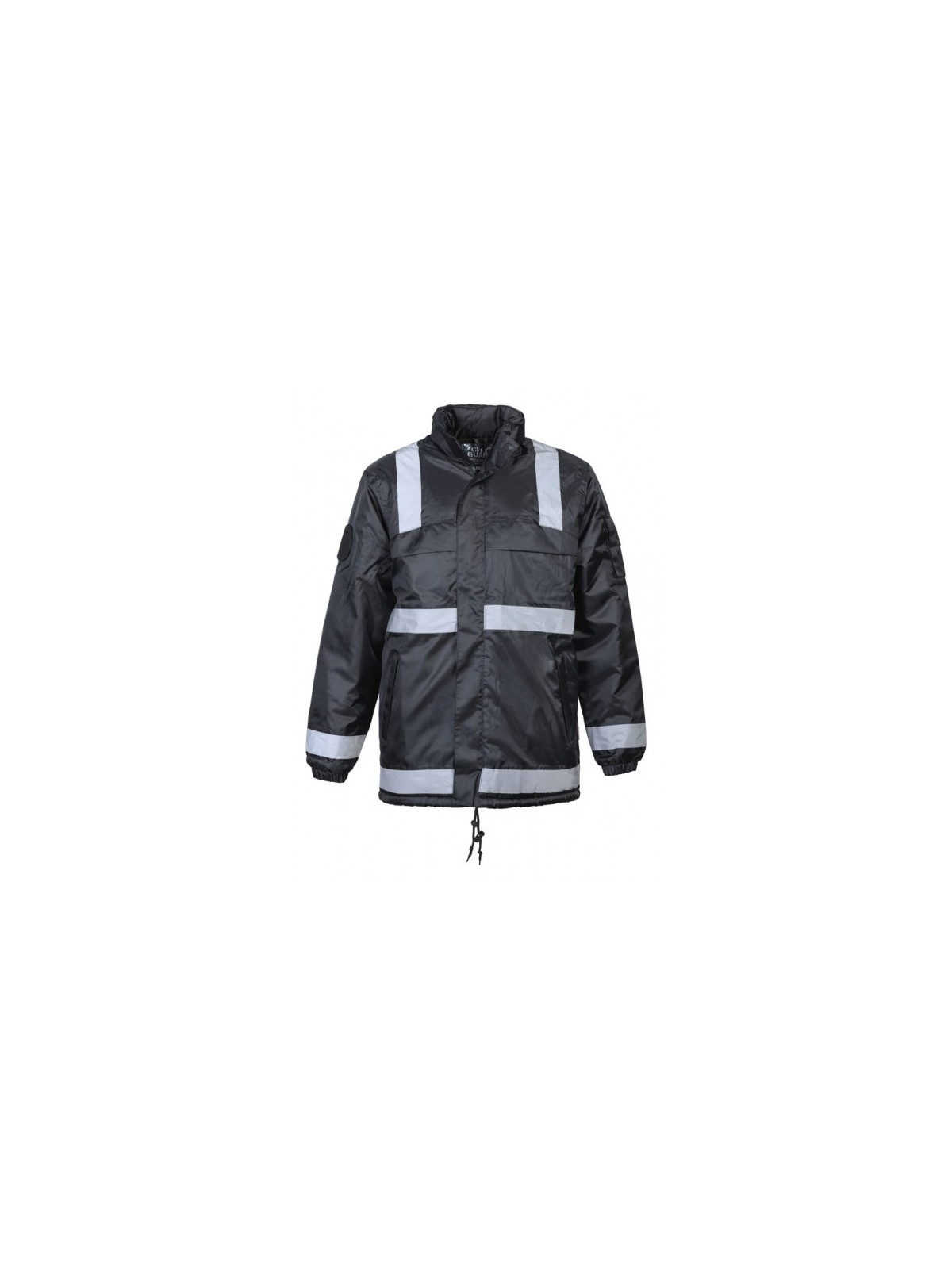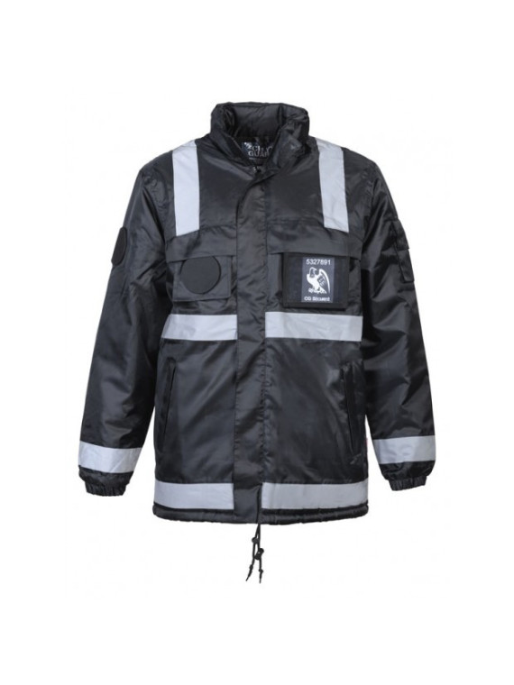100 % polyester enduit PU, coutures étanches, ouate et doublure polaire 100 % polyester 5 poches extérieures – 5 poches intérieures dont une pour téléphone portable – 1 poche dos avec bande amovible "SÉCURITÉ"– flap “SÉCURITÉ” et porte-écusson amovibles, cordon de serrage, capuche intégrée au col
